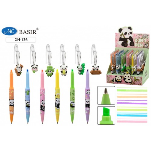 Ручка 2в1: детская "ПАНДА"; двусторонняя-авторучка с поворотным механизмом+текстовыделитель, с брелоком, цветной корпус с рисунком /ассорти/. XH-136