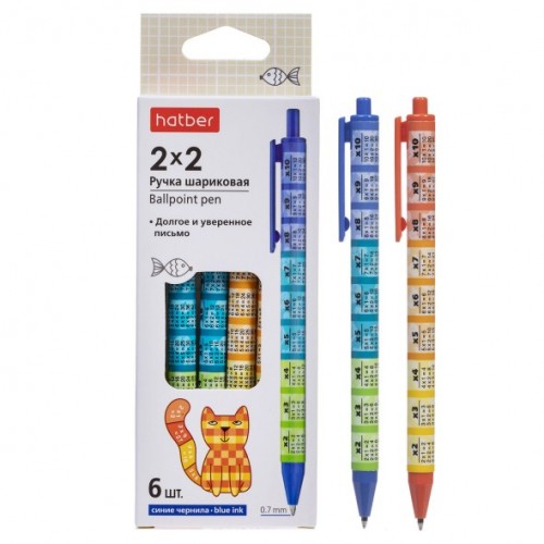 BP_083654 Набор шариковых ручек Автомат. Hatber 2х2 с табл.умножения Синяя 0,7мм 6 шт. в картонной коробке ассорти..