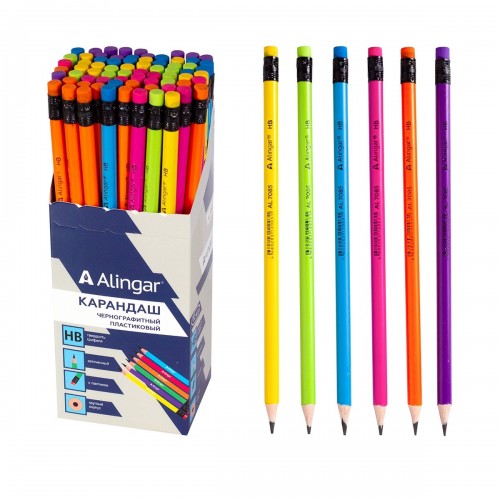 Карандаш ч/г Alingar HB, пластик, с ластиком, круглый, заточенный, корпус ассорти (малиновый, желтый, синий, салат., оранж, фиолет.), 72 шт/уп..