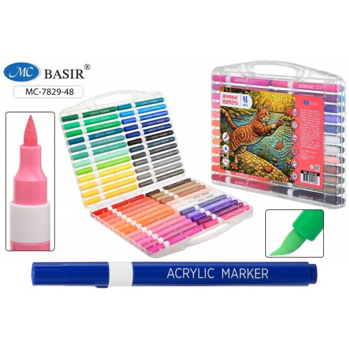 Набор маркеров-акриловые "КОТ": с мягкой кистью; на водной основе, толщина линии 1-5 mm, для любых поверхностей; цветной корпус /длина 13,8 см/, вентилируемый колпачок, упаковка-пластмассовый бокс, 48 цветов...