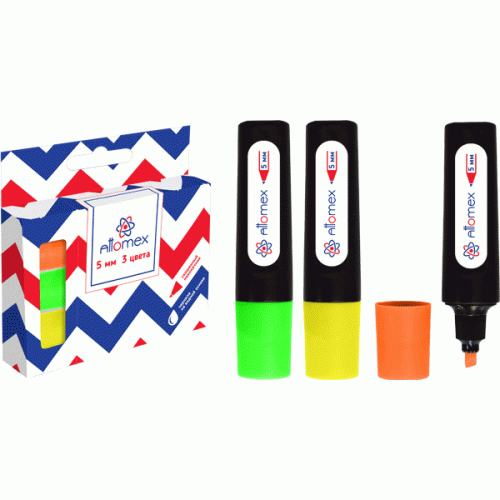 Набор маркеров-выделителей "Attomex" (03 цв - желт, зел, оранж) плоский корпус, скошенный наконечник, ширина линии 1-5 мм, в картонной коробке..