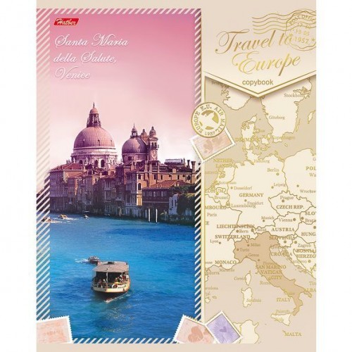 Тетрадь А5 48 л. клетка ХАТБЕР "ПУТЕШЕСТВИЕ В ЕВРОПУ", мат.ламин., 3D фольга, скоба, 5 диз. в блоке