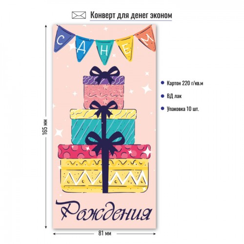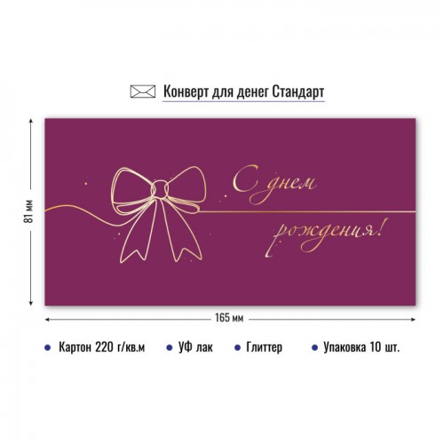 Конверты для денег стандарт формата 164×81 мм, материал: картон плотностью 210 г/кв.м. Обработка: УФ-лак, глиттер. Упакованы по 10 штук одного вида...