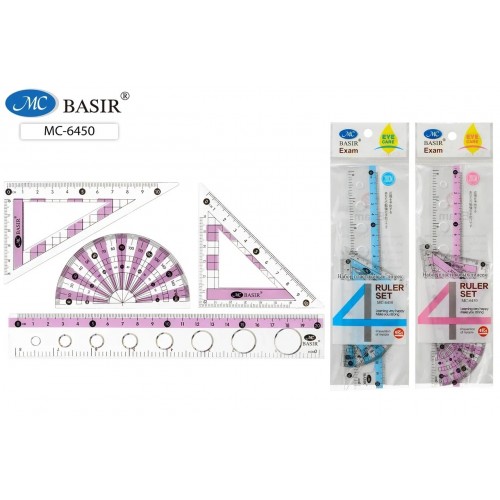 Набор линеек: 4 предмета: пластиковые, прозрачные с цветными вставками; 2 треугольника, транспортир, линейка с трафаретом 20 см; в п/э упаковке...