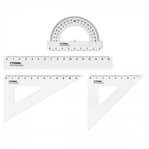 Комплектация набора: линейка, два треугольника, транспортир...