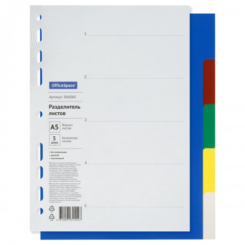 Разделитель листов OfficeSpace А5, 5 листов, без индексации, цветной, пластиковый..