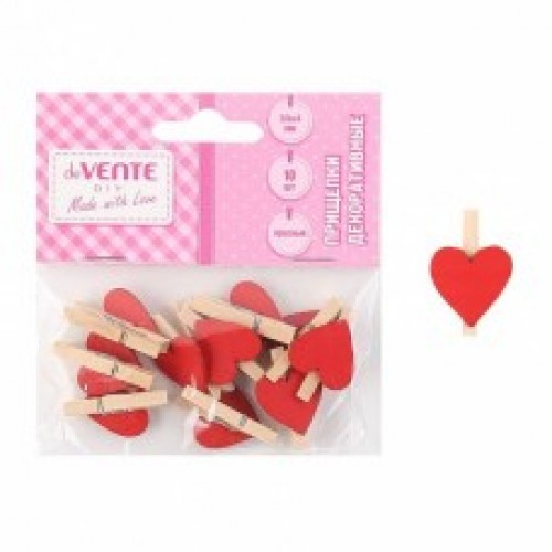 Прищепки декоративные "deVENTE. Hearts" деревянные, 30x4 мм, 10 шт, в пластиковом пакете с блистерным подвесом, красные..