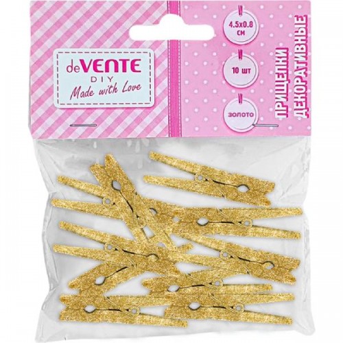 Прищепки декоративные "deVENTE. Golden" деревянные, размер 45x8 мм, 10 шт золотистые металлик, в пластиковом пакете с блистерным подвесом