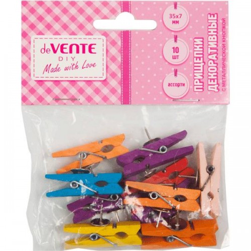 Прищепки декоративные с металлической кнопкой "deVENTE. Spin & Pin" деревянные, 35x7 мм, 10 шт, в пластиковом пакете с блистерным подвесом, ассорти цветов