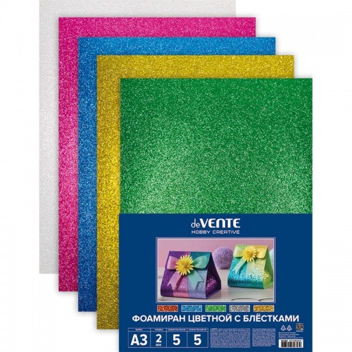 Фоамиран цветной с блёстками A3 "deVENTE" 5 цв, 5 л, толщина 2 мм, пластиковый пакет с европодвесом. Цвета: серебряный, золотой, розовый, синий, зеленый.
