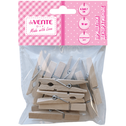 Прищепки декоративные "deVENTE. DIY Natural Wood" деревянные, размер 45x7 мм, 10 шт, натуральный цвет, в пластиковом пакете с блистерным подвесом