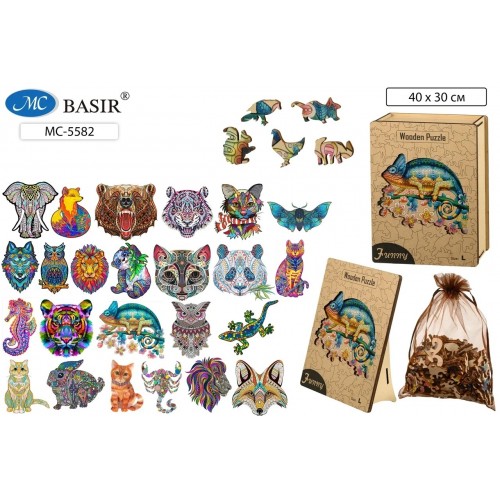 Деревянные фигурные пазлы: "ЖИВОТНЫЕ" размер L(A3)-30*40 см, в деревянной подарочной коробке; развивающая головоломка для детей и взрослых, в процессе сборки тренируется моторика, пространственное мышление и воображение; мелкие детали различной формы изготовлены из дерева.