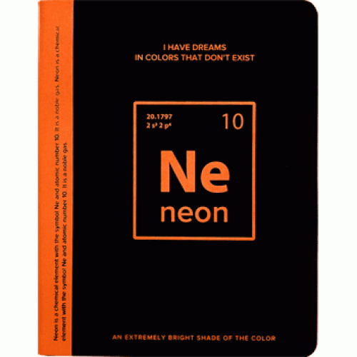 A5 (145 ммx205 мм), 160 стр, кремовая бумага 70 г/м² в клетку, печать в 1 краску, твердая комбинированная обложка из искусственной кожи, неоновая шелкография, 1 ляссе..