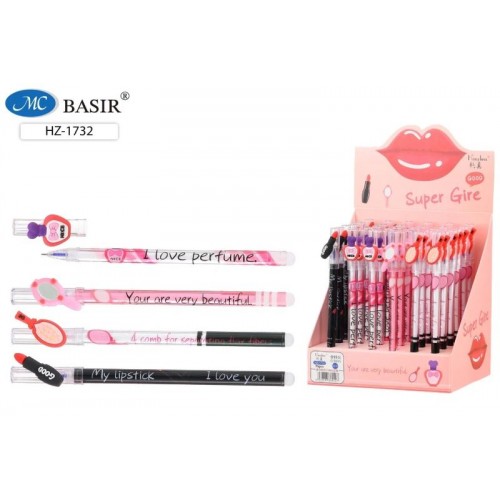 Ручка со стираемыми чернилами гелевая : "ДАМСКИЕ ШТУЧКИ"; цветной с рисунком корпус /ассорти/, колпачок с фигуркой-помада, духи, зеркальце; толщина пишущего наконечника-0,5 mm; цвет чернил-синий...