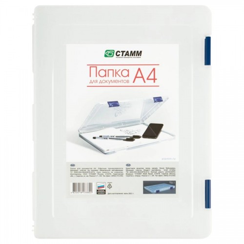 Папка для документов А4 Стамм, 230 х 305 х 23 мм, пластик, прозрачный корпус, синие защелки..