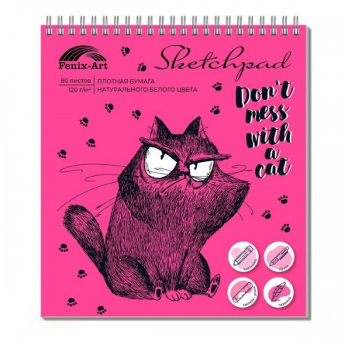 Скетчпад 155*180 80л. 120г/м, РОЗОВЫЙ КОТ тв. переплёт на гребне..