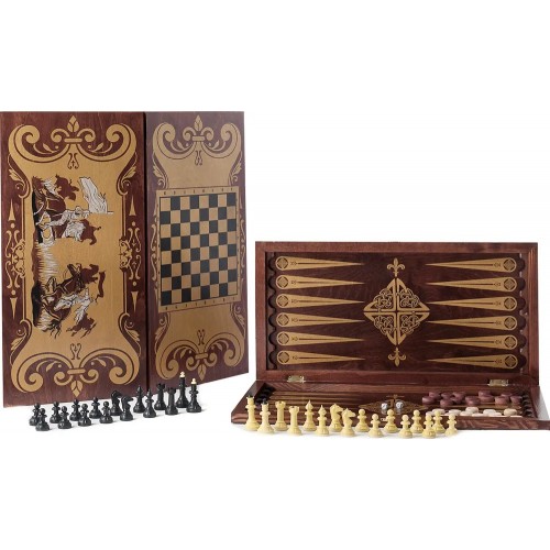 Игра 3в1 большая венге, рисунок золото с обиходными пластмассовыми шахматами "Гравюра" (600*300*40)..